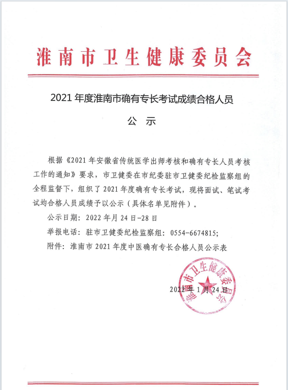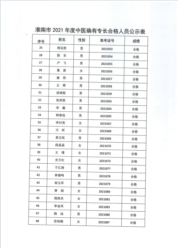 2021年度安徽省淮南市確有專長考試成績合格名單
