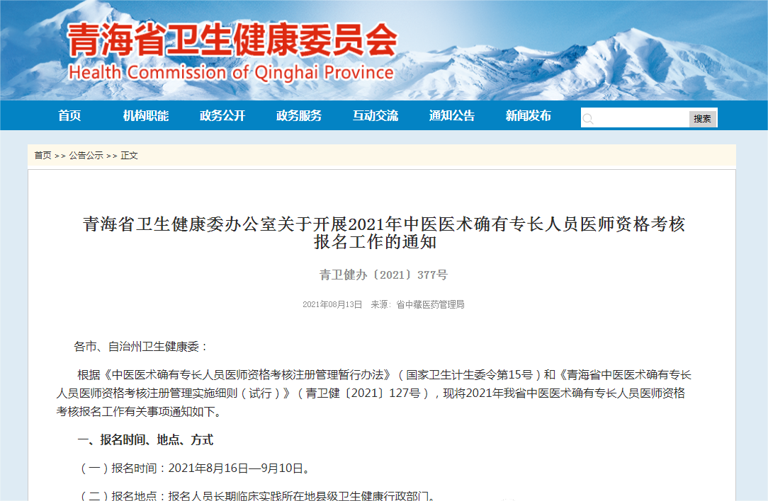 根據(jù)《中醫(yī)醫(yī)術(shù)確有專長人員醫(yī)師資格考核注冊(cè)管理暫行辦法》(國家衛(wèi)生計(jì)生委令第15號(hào))和《青海省中醫(yī)醫(yī)術(shù)確有專長人員醫(yī)師資格考核注冊(cè)管理實(shí)施細(xì)則(試行)》(青衛(wèi)健〔2021〕127號(hào)),現(xiàn)將2021年我省中醫(yī)醫(yī)術(shù)確有專長人員醫(yī)師資格考核報(bào)名工作有關(guān)事項(xiàng)通知如下。