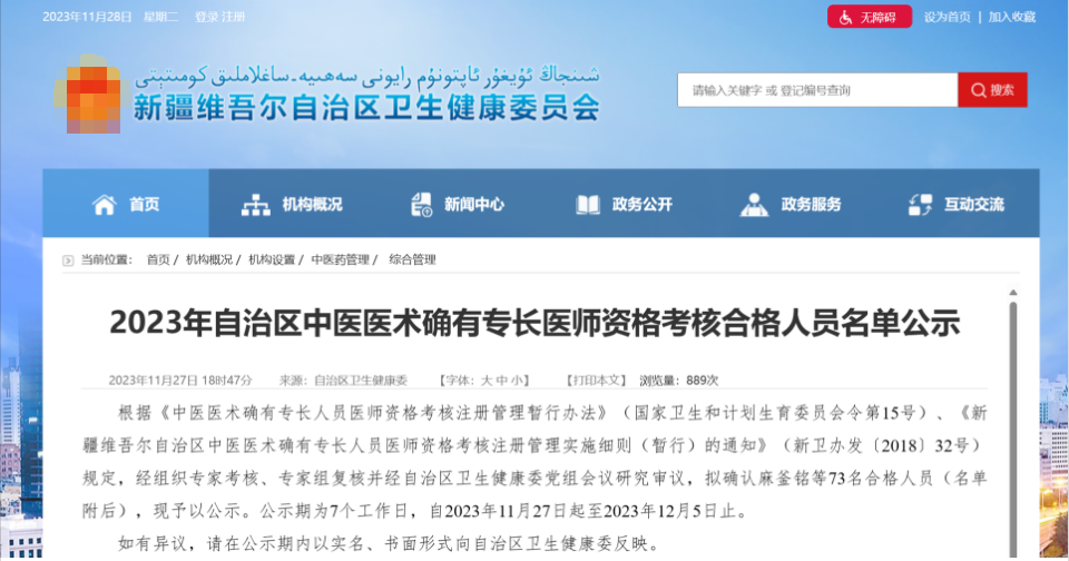 根據(jù)《中醫(yī)醫(yī)術(shù)確有專長人員醫(yī)師資格考核注冊管理暫行辦法》(國家衛(wèi)生和計劃生育委員會令第15號)、《新疆維吾爾自治區(qū)中醫(yī)醫(yī)術(shù)確有專長人員醫(yī)師資格考核注冊管理實(shí)施細(xì)則(暫行)的通知》(新衛(wèi)辦發(fā)〔2018〕32號)規(guī)定,經(jīng)組織專家考核、專家組復(fù)核并經(jīng)自治區(qū)衛(wèi)生健康委黨組會議研究審議,擬確認(rèn)麻釜銘等73名合格人員(名單附后),現(xiàn)予以公示。公示期為7個工作日,自2023年11月27日起至2023年12月5日止。