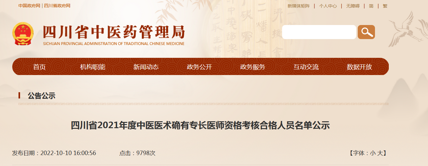 按照《中醫(yī)醫(yī)術(shù)確有專長人員醫(yī)師資格考核注冊管理暫行辦法》和《四川省中醫(yī)醫(yī)術(shù)確有專長人員醫(yī)師資格考核注冊管理實(shí)施細(xì)則(暫行)》的規(guī)定,經(jīng)專家考核,宋玉生等433名確有專長人員合格(名單附后),現(xiàn)予以公示。公示期為5個(gè)工作日,自2022年10月10日起至2022年10月14日止。