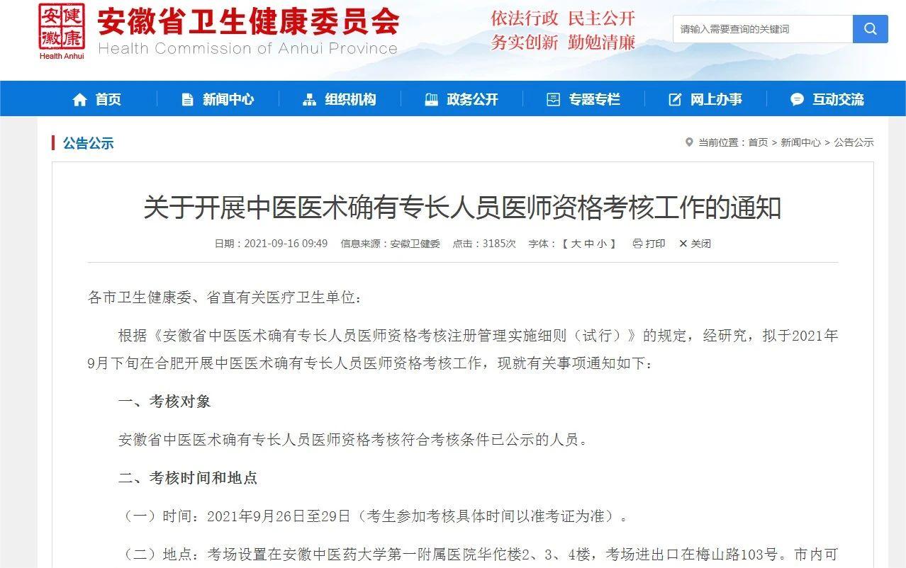 根據(jù)《安徽省中醫(yī)醫(yī)術(shù)確有專長人員醫(yī)師資格考核注冊管理實施細(xì)則(試行)》的規(guī)定,經(jīng)研究,擬于2021年9月下旬在合肥開展中醫(yī)醫(yī)術(shù)確有專長人員醫(yī)師資格考核工作,現(xiàn)就有關(guān)事項通知如下: