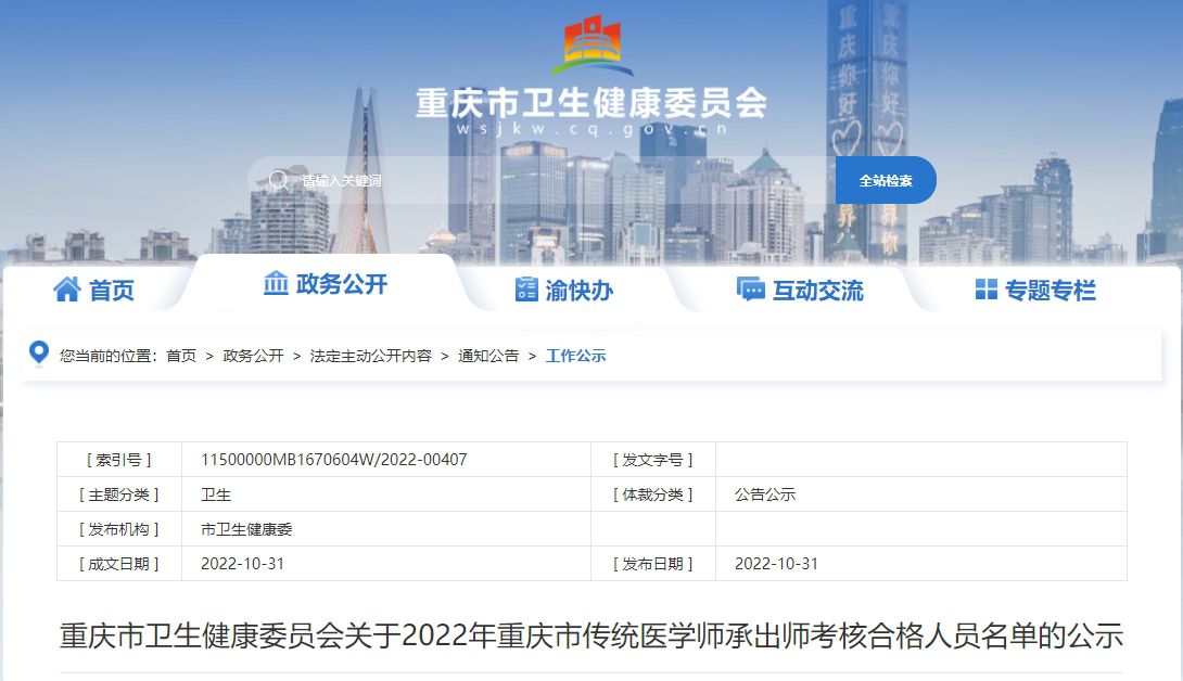 重慶市衛(wèi)生健康委員會關(guān)于2022年重慶市傳統(tǒng)醫(yī)學(xué)師承出師考核合格人員名單的公示