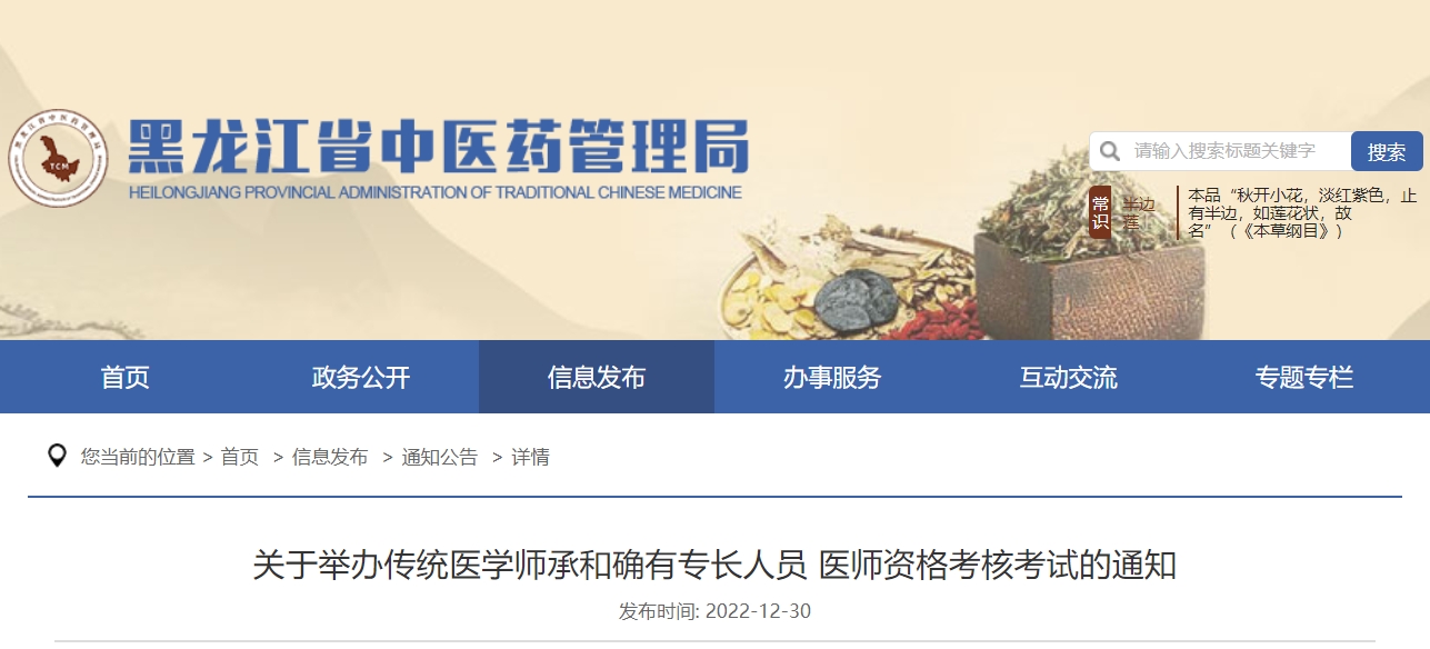 為認(rèn)真貫徹落實(shí)《中華人民共和國中醫(yī)藥法》精神,按照《中醫(yī)醫(yī)術(shù)確有專長人員醫(yī)師資格考核注冊管理暫行辦法》(中華人民共和國衛(wèi)生和計(jì)劃生育委員會令第15號)和《黑龍江省中醫(yī)醫(yī)術(shù)確有專長人員醫(yī)師資格考核注冊管理實(shí)施細(xì)則》(黑衛(wèi)中醫(yī)規(guī)發(fā)〔2018〕32號)(以下簡稱《實(shí)施細(xì)則》)工作要求,現(xiàn)開展2023年度黑龍江省中醫(yī)醫(yī)術(shù)確有專長人員醫(yī)師資格考核工作,并將考核報名相關(guān)事宜通知如下: