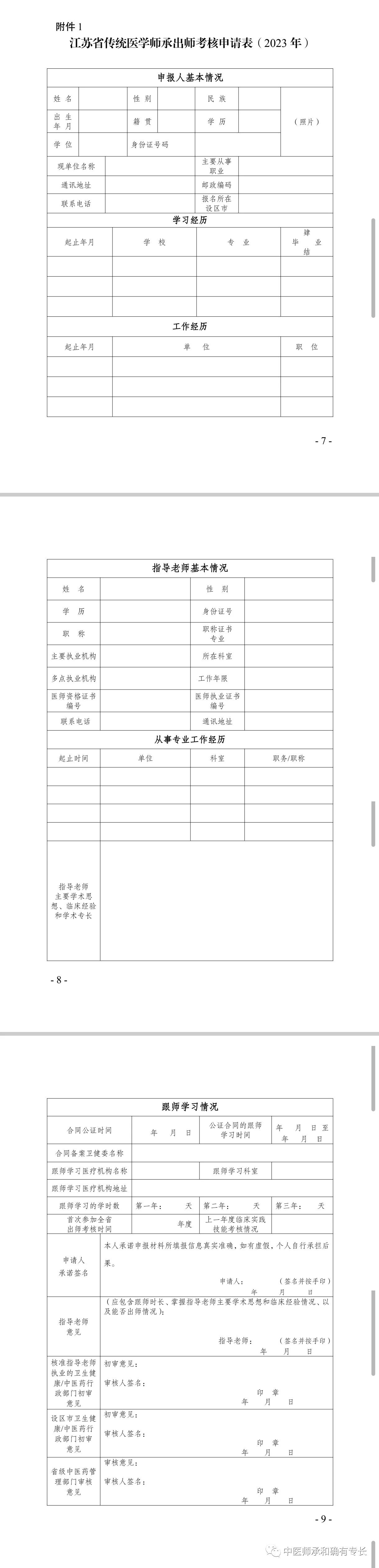 2.《江蘇省傳統(tǒng)醫(yī)學(xué)師承出師考核申請(qǐng)表(2023年)》(附件1,報(bào)名系統(tǒng)打印);