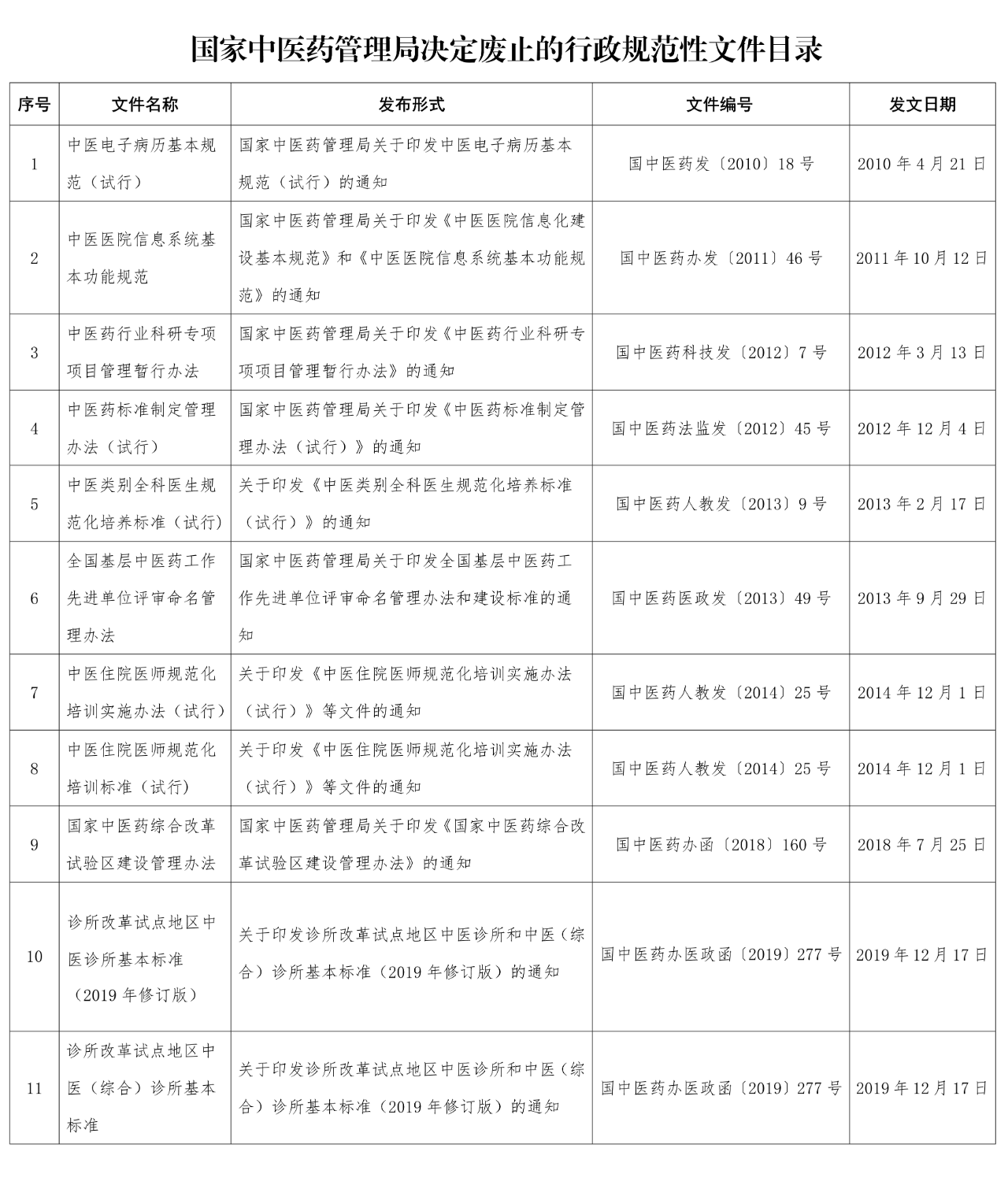 國家中醫(yī)藥管理局關(guān)于公布現(xiàn)行有效和決定廢止的行政規(guī)范性文件目錄的通告